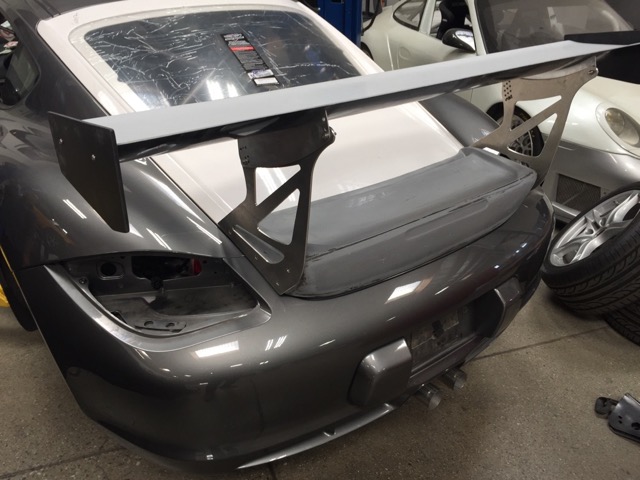 New for 987. The new 718 track top win assembly with swan neck mounting. Includes top wing, end plates, mounting brackets, and a special hatch for track.